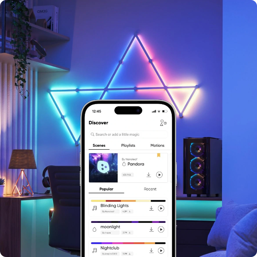 Explore the Nanoleaf community. Download new Scenes and upload your own creations! Check out our playlists that are curated for different moods and activities throughout your day.